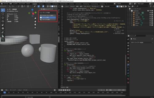 本日は Blender の技術調査枠です。 Blender3.0で利用可能なpythonスクリプトを作ります。 シェーディングタイプを切り替える選択肢ボタンを並べて配置する 複数の選択肢から一つのボタンを選択可能なプロパティは EnumProperty で作成します。 docs.blender…