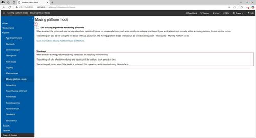 本日はHoloLens2の調査枠です。 HoloLens2のデバイスポータル(DevicePortal)の機能についてです。本記事は「Moving Platform Mode (移動プラットフォームモード)」ページです。 移動プラットフォームモード 移動プラットフォームモードは大型船などの移動環…
