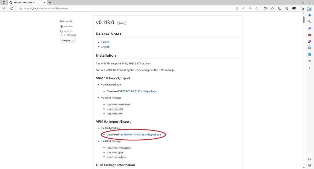 以下の URL から UniVRM-0.113.0_0165.unitypackage をダウンロードします。