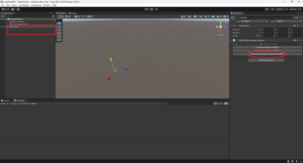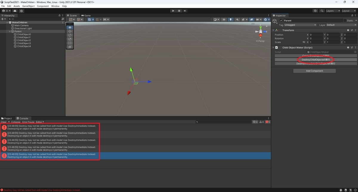 Destory と DestroyImmediate の動作の違いを確認するため、2種類の削除関数を用意しています。