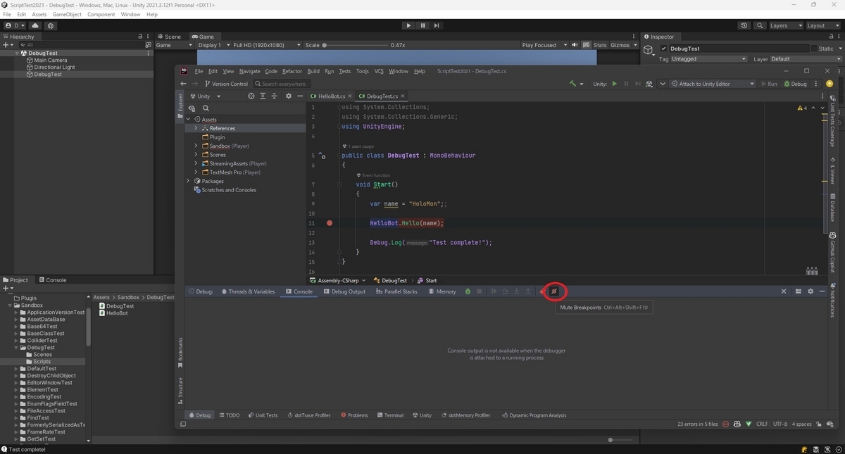 全てのブレークポイントを一時的に無効化したい場合は[ブレークポイントのミュート]を有効にするとブレークポイントで停止しなくなります。