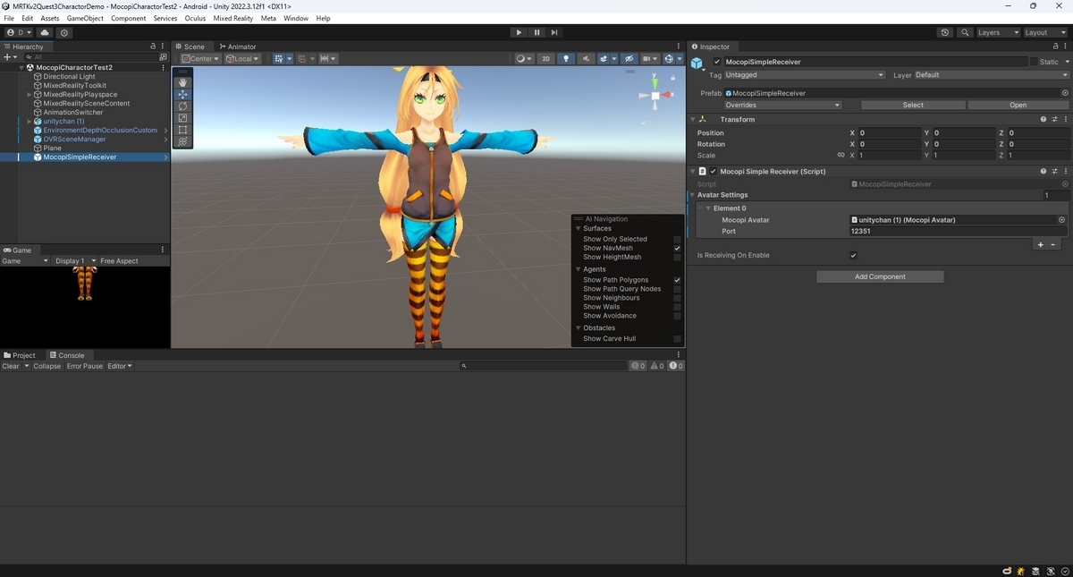 以下の通りQuestアプリでもmocopiのモーションデータを受け取ってキャラクターに反映できました。