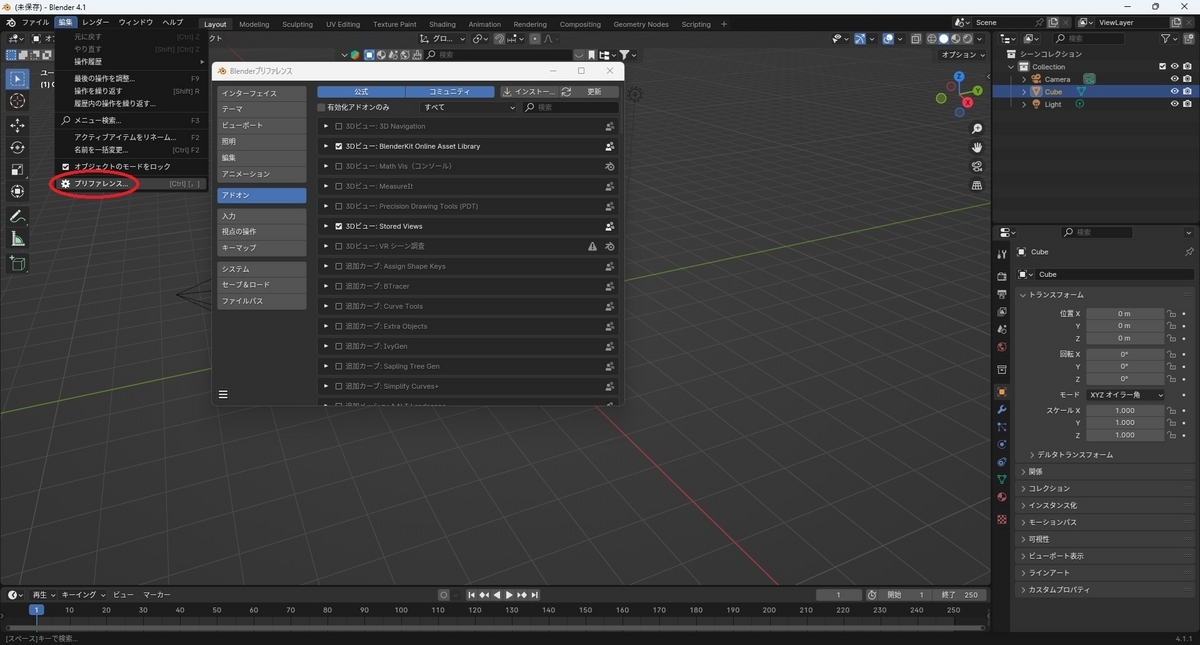 メニューから[編集 -> プリファレンス]を開きます。