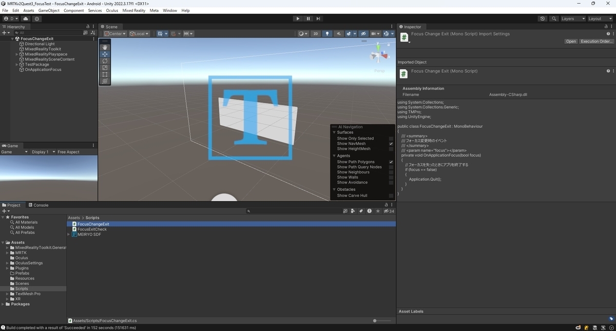 スクリプトを設定したプロジェクトをビルドしてQuest3へのデプロイします。