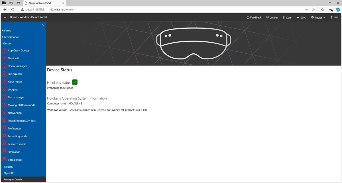 HoloLens2のDevicePortal(デバイスポータル)の基本的な利用手順については以下の記事を参照ください。