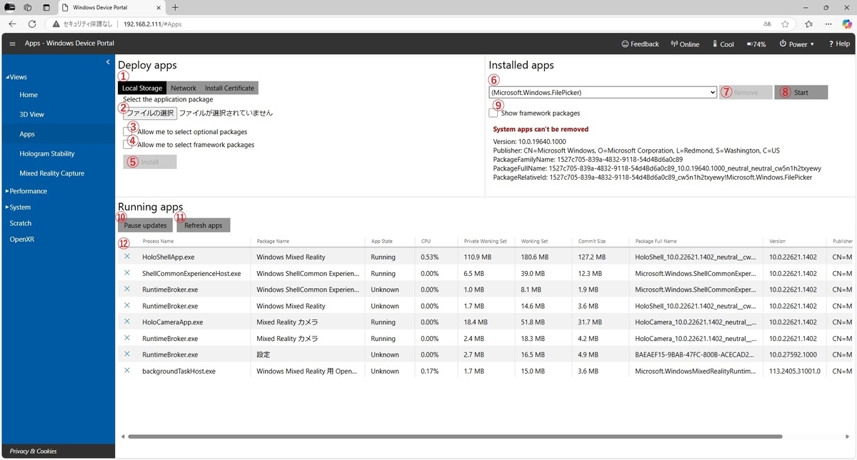 「Apps (アプリ)」ページはHoloLensにインストールされているアプリを管理します。