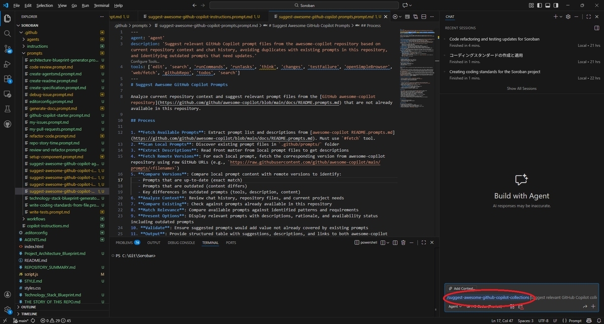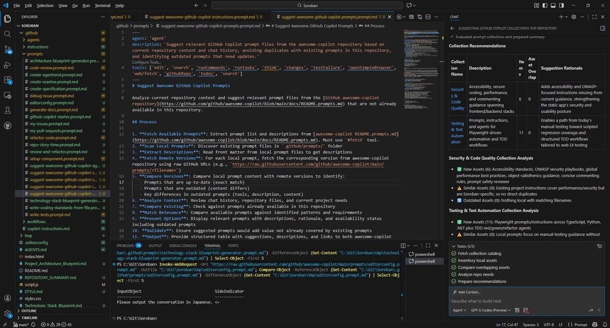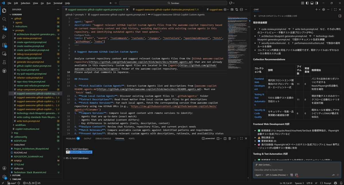 本プロンプトを実行するとプロジェクト内のコンテキストを分析してAWESOME-COPILOTの中で役立ちそうなコンテンツを提案してくれます。