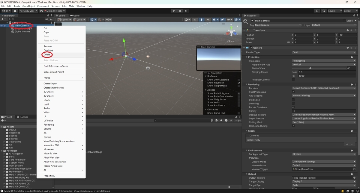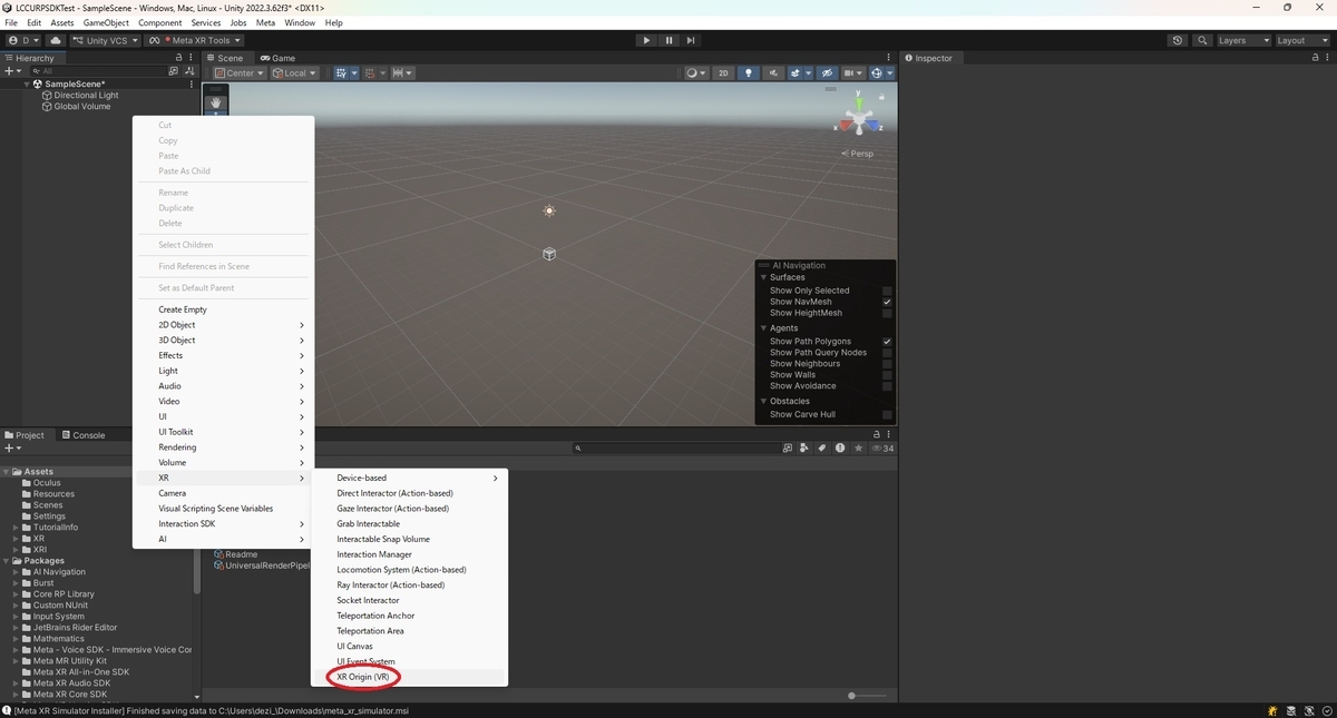 Hierarchy上で右クリックから[XR -> XR Origin (VR)]を追加します。