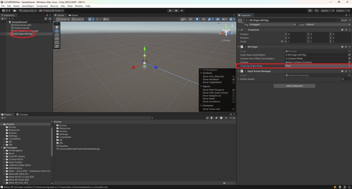 追加したXR Origin (XR Rig)オブジェクトを選択して、Inspectorビューから[Tracking Origin Mode]を[Floor]に設定します。