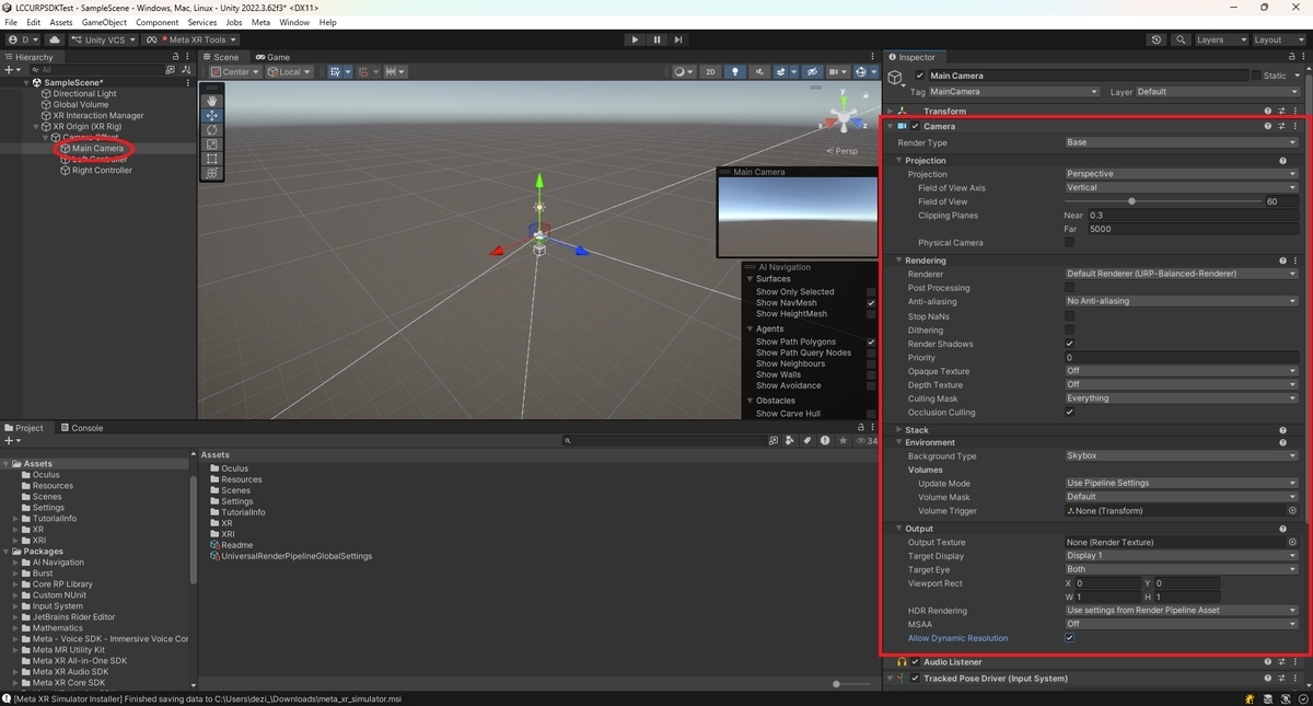 XR Origin (XR Rig)オブジェクト内のMain Cameraを選択してInspectorビューを開きます。