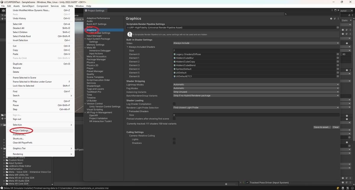 [Edit -> Project Settings..]を開き、[Graphics]タブを開きます。